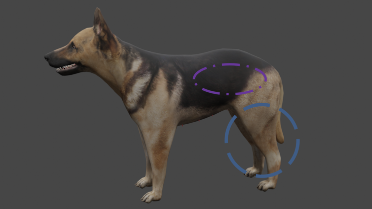 De basis van een 3D model van de hond. Omcirkeld zijn de anatomische gebieden die zijn doorontwikkeld, het vrouwelijke geslachtsapparaat van de teef (paars) en de knie (blauw).