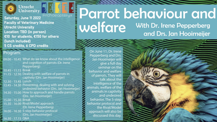 In het dagvullende programma (van 9:00 tot 17:15 uur) wordt onder meer ingegaan op de intelligentie van papegaaien, het welzijn van de papegaai als gezelschapsdier en de preventie en omgang met gedragsproblemen. Dit seminar is in het Engels. Het ‘Parrot Behaviour and Welfare’ seminar wordt georganiseerd door Utrecht University en Veterinaire vereniging Archaeopteryx. Wil je je inschrijven of meer weten over dit seminar, kijk dan op de site van Veterinaire vereniging Archaeopteryx